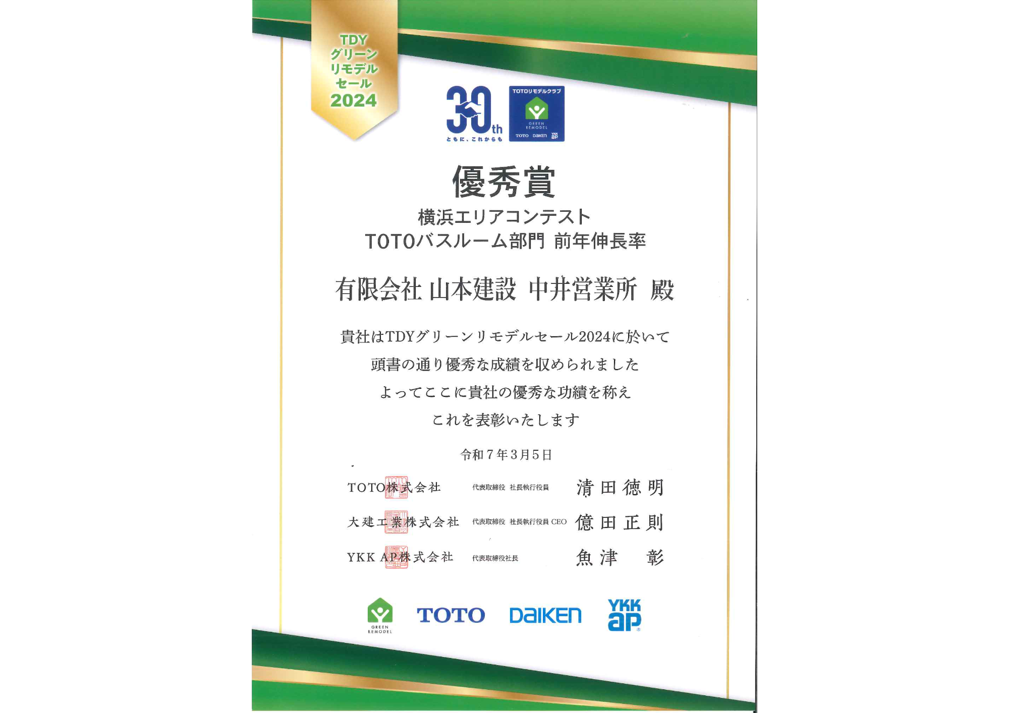 『TDYグリーンリモデルセール2024』の『横浜エリアコンテスト TOTOバスルーム部門 前年伸長率』において、" 優秀賞 " を受賞いたしました。